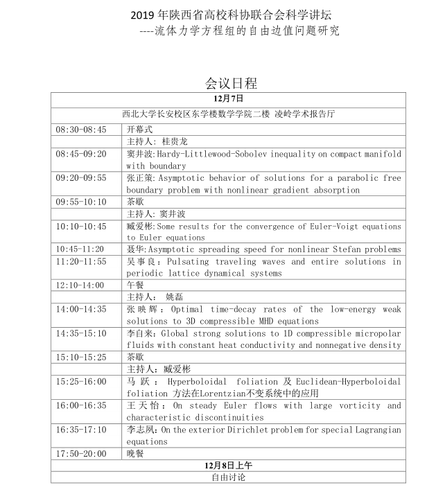 公司将于2019年12月6-8日在学院凌岭学术报告厅举办2019 年陕西省高校科协联合会科学讲坛—流体力学方程组的自由边值问题研究,欢迎各位老师参加。